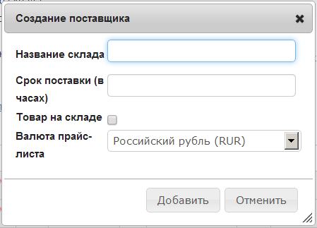Создайте склад в разделе "Поставщики". Для этого зайдите в Панель управления -> меню "Поставщики" и нажмите в блоке "4MyCar" ссылку “Добавьте первый прайс-лист”. Появится окно “Создание поставщика”. В данном окне нужно ввести: