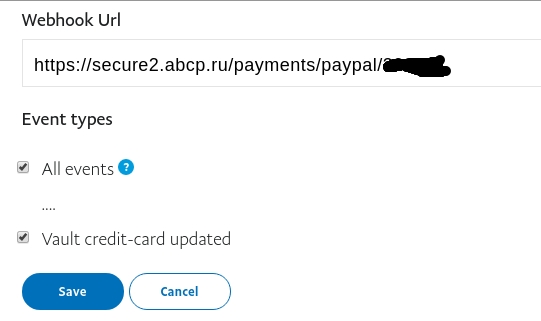 В URL вводим https://secure.abcp.online/payments/paypal/ID, который указан в вашей ПУ на странице настройки ПС, выбираем All events, добавляем.