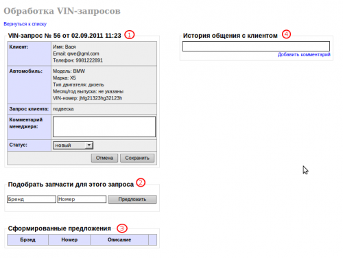 Нажав иконку редактирования одного из запросов, мы попадаем на страницу, содержащую несколько областей: 1) Общая информация о клиенте, его автомобиле, текст запроса, а также контролы для смены статуса запроса и возможность оставить комментарий менеджера. 2) Форма для подбора запчасти для этого запроса. 3) Таблица, отображающая предложенные вами клиенту запчасти. 4) Чат и история вашего с клиентом общения.