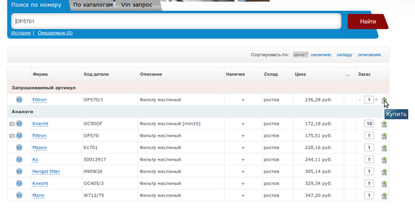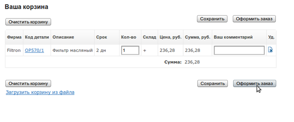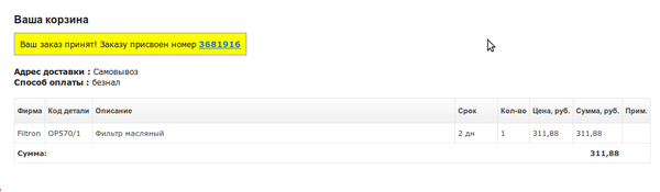 Клиент производит проценку детали, выполняя поиск через артикул на сайте. Найдя необходимую запчасть (или запчасти), клиент указывает в строке выбранной детали в поле "Заказ" нужное количество и нажимает на кнопку с корзиной, перенося, тем самым, информацию в "Корзину".