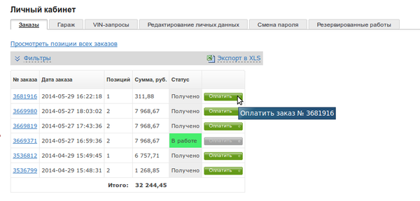 Далее клиенту необходимо оплатить заказ: для этого необходимо перейти в "Личный кабинет" и во вкладке "Заказы" напротив сформированного заказа нажать на кнопку "Оплатить". Если данная кнопка неактивна, то возможно две причины возникновения проблемы: