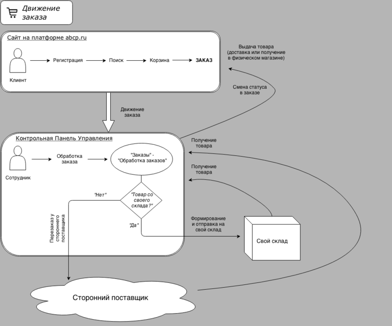 Принцип обработки заказов в ABCP заключается в прохождении им через ряд этапов, начиная с поиска запчасти клиентом на сайте и заканчивая перезаказом необходимых позиций поставщику.