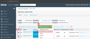 - Выберите позиции (А), у которых требуется изменить статус, нажмите кнопку "Изменить статус" (В) и выберите статус, в который требуется перевести заказ (С):