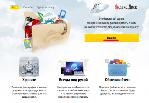 На следующем шаге нужно ввести логин и пароль и нажать на кнопку "Войти". Если вы не зарегистрированы на сайте disk.yandex.ru, то сначала придётся пройти быструю регистрацию нажав на ссылку "Зарегистрироваться".