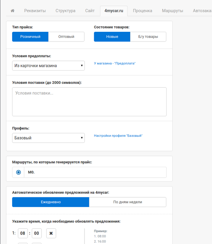 После, необходимо перейти в настройки конкретного прайса, на вкладку “На 4mycar”, и заполнить условия работы на сервисе, состояние товаров, ценовой профиль, маршрут, расписание генерации. При обновлении поставщика, виртуальный склад автоматически обновится и позиции с него будут находиться при поиске на www.4mycar.ru Если прайс должен отображаться только на 4mycar и не должен отображаться на вашем сайте - необходимо в блоке "Сайт", в настройках всего прайса, нажать "Отключить от сайта".