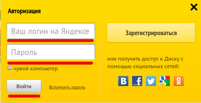 На следующем шаге нужно ввести логин и пароль и нажать на кнопку "Войти". Если вы не зарегистрированы на сайте disk.yandex.ru, то сначала придётся пройти быструю регистрацию нажав на ссылку "Зарегистрироваться".