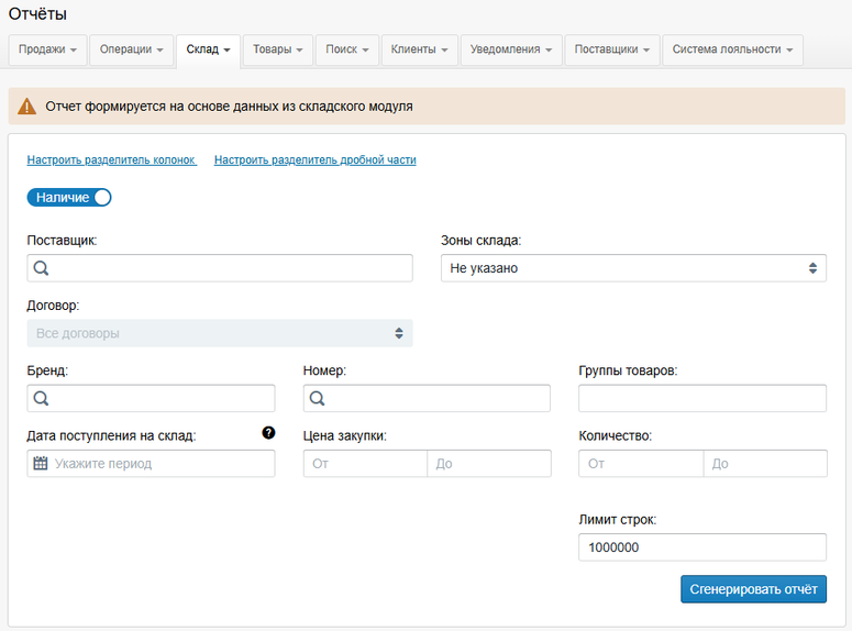 1. Получить актуальные остатки с помощью отчета "Складское наличие":
